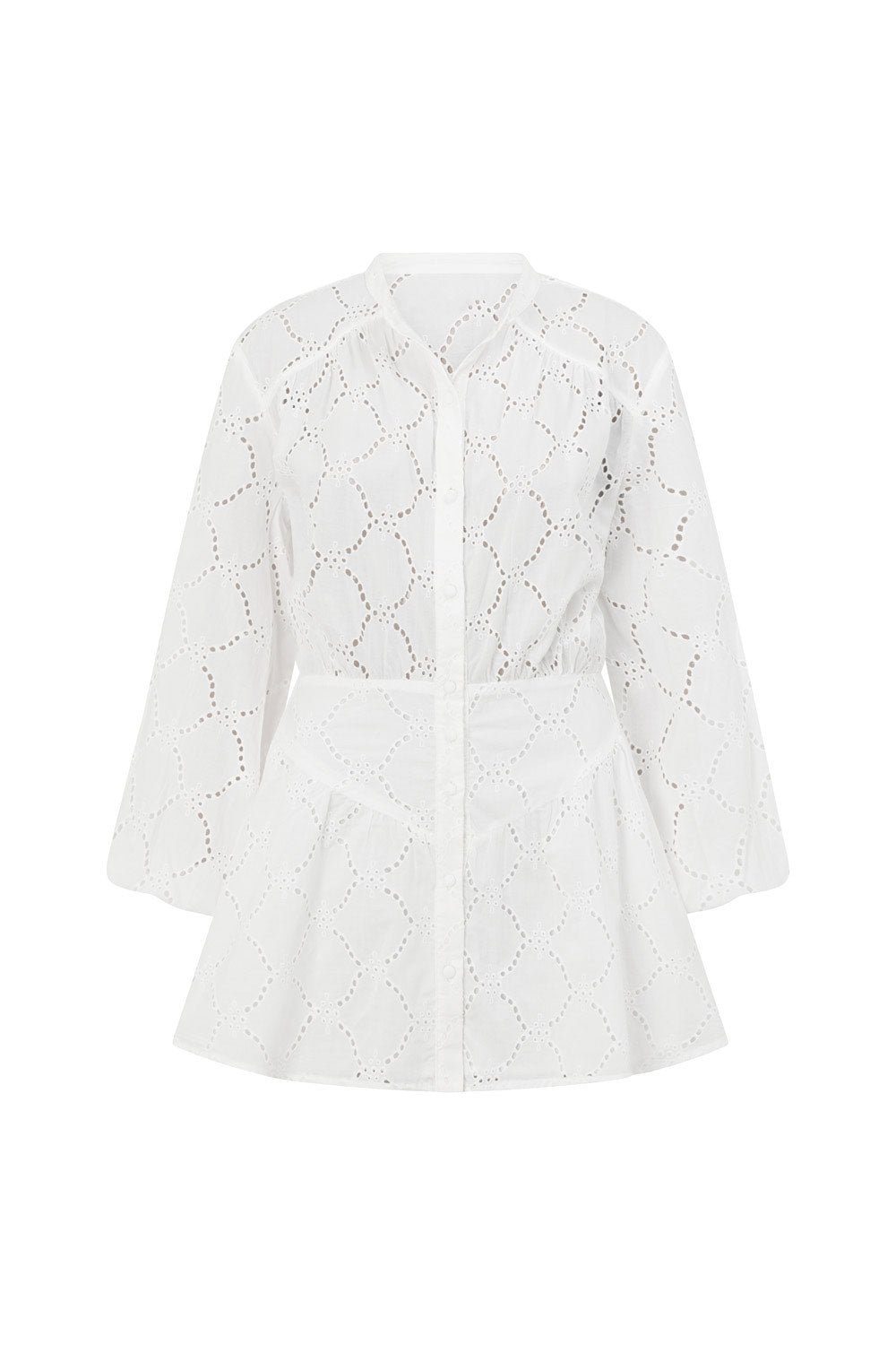 *BACK IN STOCK*?Designed to flatter, the?Naima Dress is made from a high quality natural cotton broderie fabric in white. It features billowing puff sleeves, buttons down centre front, fitted drop waist detail and flouncy mini skirt. Dress it up with the Dia Heels for date night! Designed exclusively by homodet.